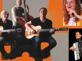 Das aktuelle Programm der Gruppe findet darüber hinaus durch die Mitwirkung der wunderbaren Sängerin Sylvia Vollmer-Werner und dem virtuosen Akkordeonisten Jens Großmann noch eine großartige Erweiterung, da hier swingender Jazz Manouche auf die besondere Intensität des französischen Chansons trifft….freuen Sie sich also auf ein ganz besonderes Konzerterlebnis.
