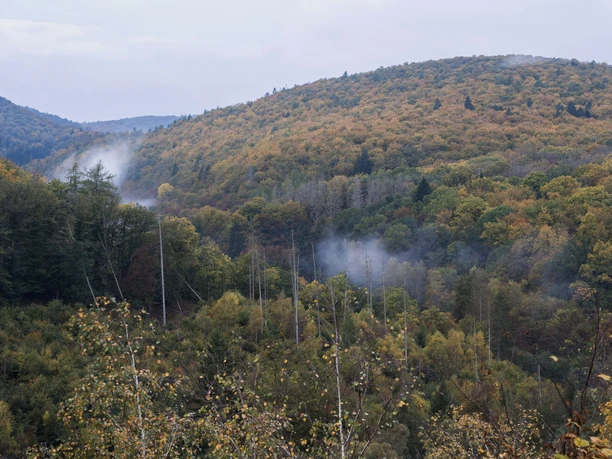 Bald darauf streifen Sie den Naturwald am „Weißen Stein“ und passieren die Westflanke des großen Hochspeicherbeckens. Hier haben Sie gleichzeitig einen der spektakulärsten Weitblicke der Region, Kamera bereithalten!